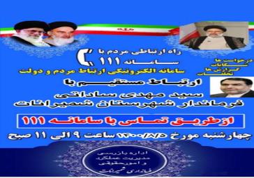 فردا(چهارشنبه) فرماندار شمیرانات در ارتباط مستقیم و با حضور در سامانه سامد (111) پاسخگوی مردم شهرستان خواهد بود.